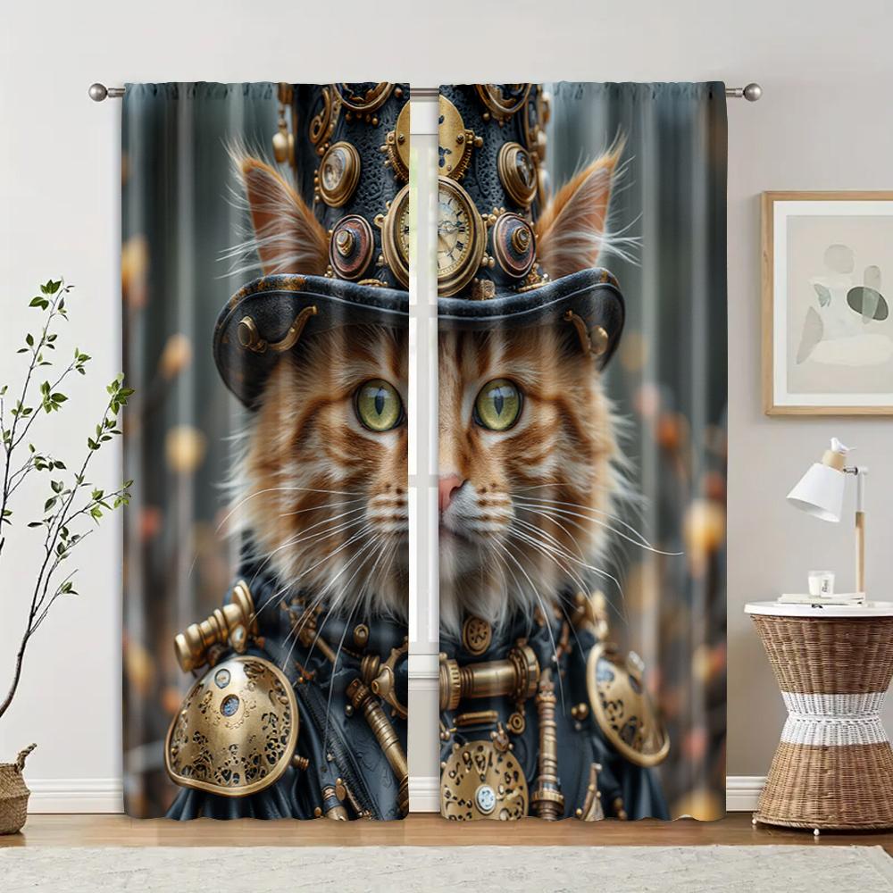 2 Pcs Filtering Curtains (excluding Rods Non-movable Without Batteries) Whimsical Steampunk Kitten for Use In Bedrooms and