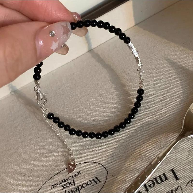 Sliver-Plated Black Agate Bracelet For Women Girl Bead Korean Versatile Design Simple Jewelry Gift