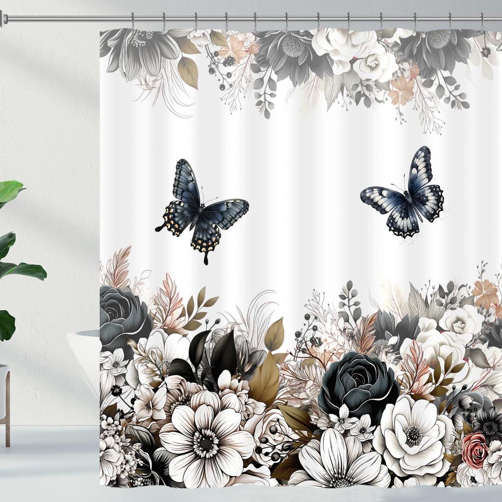 Black And White Flower Shower Curtain Flower Butterfly Shower Curtain With Hook Dark Flower Leaf Plant Bathroom Curtain Waterproof Shower Curtain