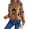 Women's V-Neck Star-Print Sweater Ragged Hem Style Long Sleeves Knitted Pullover