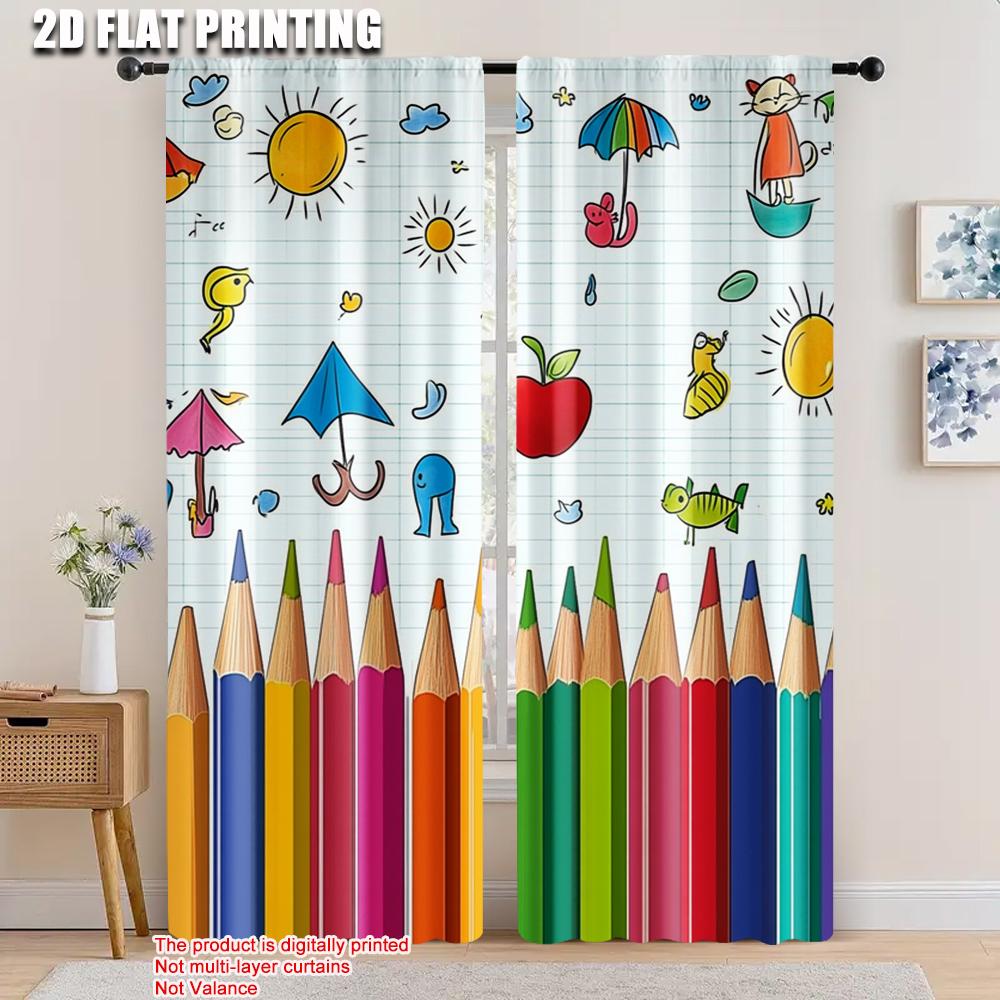2pcs Spring Summer Curtains Colorful Drawing Pencils Doodle Light Filtering Sheer Curtains Polyester Easy Install Decorations