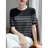 Diamond Hollow Striped Short-sleeved Round Neck Comfortable Fit Ice Silk Top Light Luxury Color-blocking T-shirt Knitted Sweater