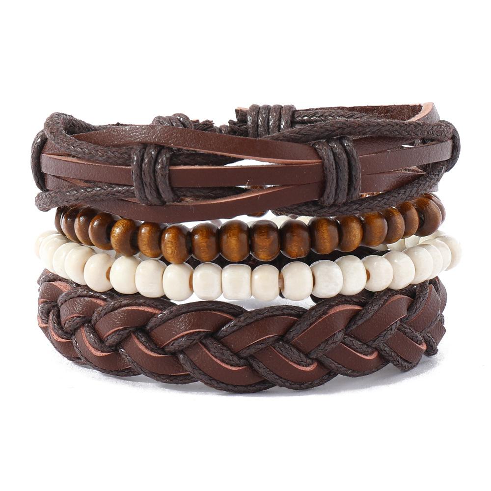 Foreign Trade Hot-selling Retro Style Handmade Wooden Beads Beaded Leather Hand Rope Combination Set Men's Woven Leather Bracelet