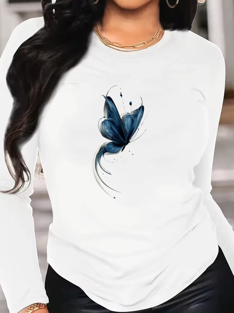 (Asian Size) Tee O-neck Print Autumn Winter Spring Women Clothing 90s Butterfly Trend Casual Long Sleeve T Shirt Fashion Top Graphic T-shirts