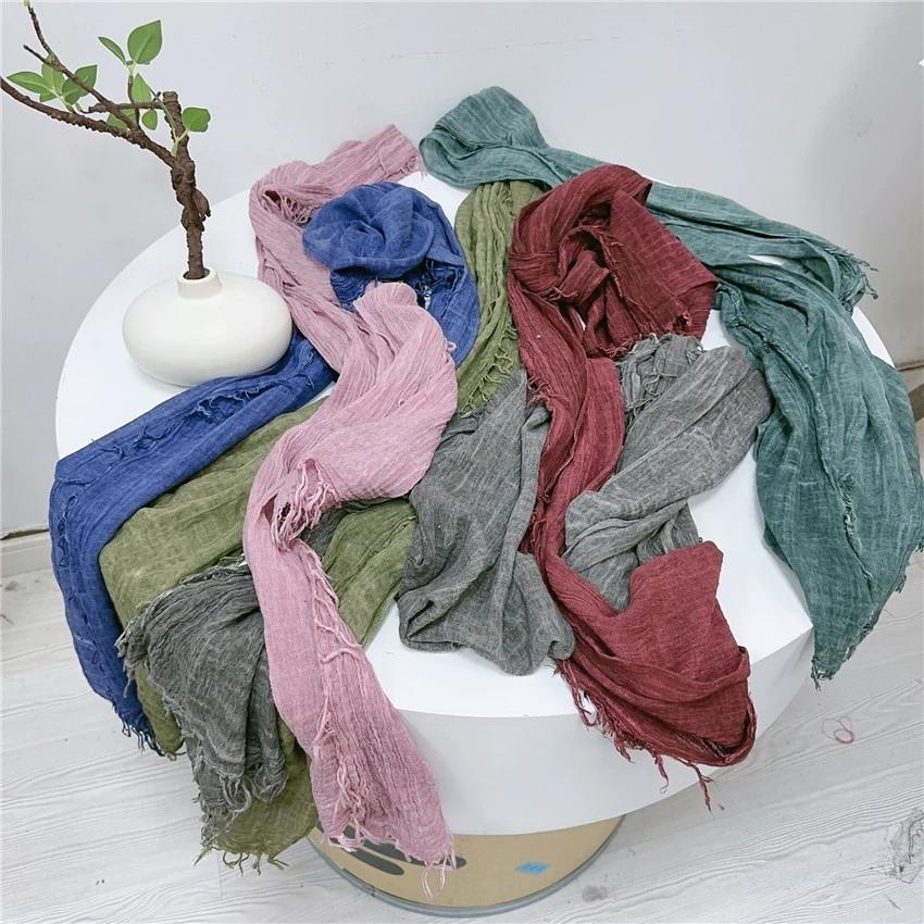 Retro Fluffy Edges Cotton Scarf Personality Wrinkle Design Slender Spring Summer Long Scarves