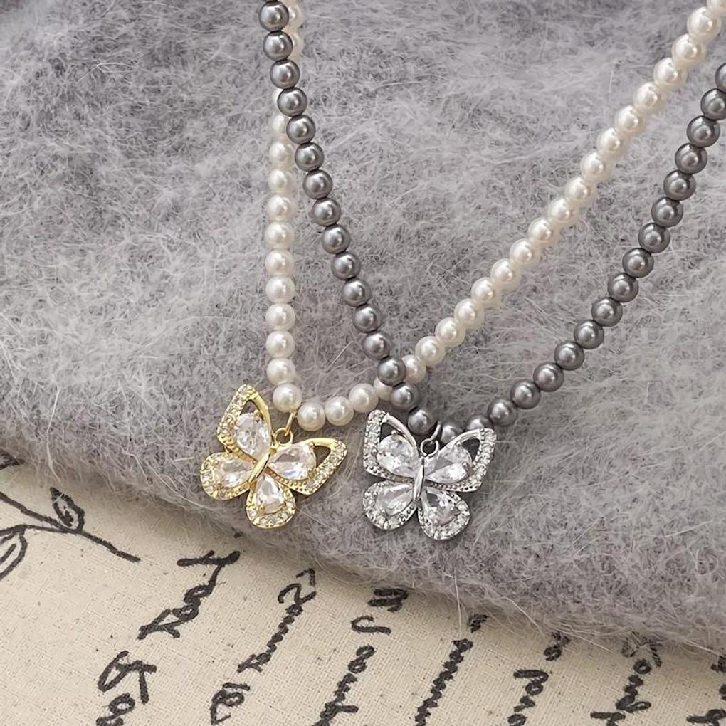 Women's 2-color French Pearl Cubic Butterfly Necklace