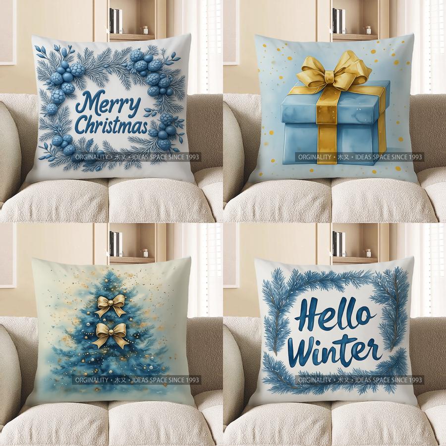 Home Decor Blue Pine Wreath Merry Christmas Pillow Pattern Cushion Cover Suitable For Sofa Bedroom Car Pillow Cover