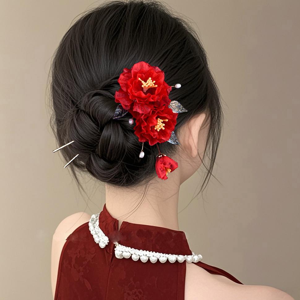 Red Silk Flower Ancient Style Hairpin and U-Shaped Pin Hair Accessory for Qipao, Hanfu, or Wedding