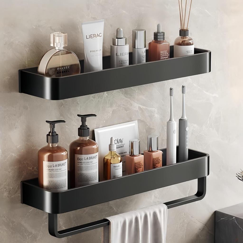 Black Space-Saving Aluminum Wall Shelf & Towel Rack - No Drilling Needed