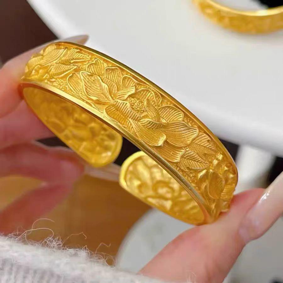 Vietnamese Gold Peony Engraved Wide Bangle: Symbol of Prosperity for Women - Ideal Wedding Jewelry