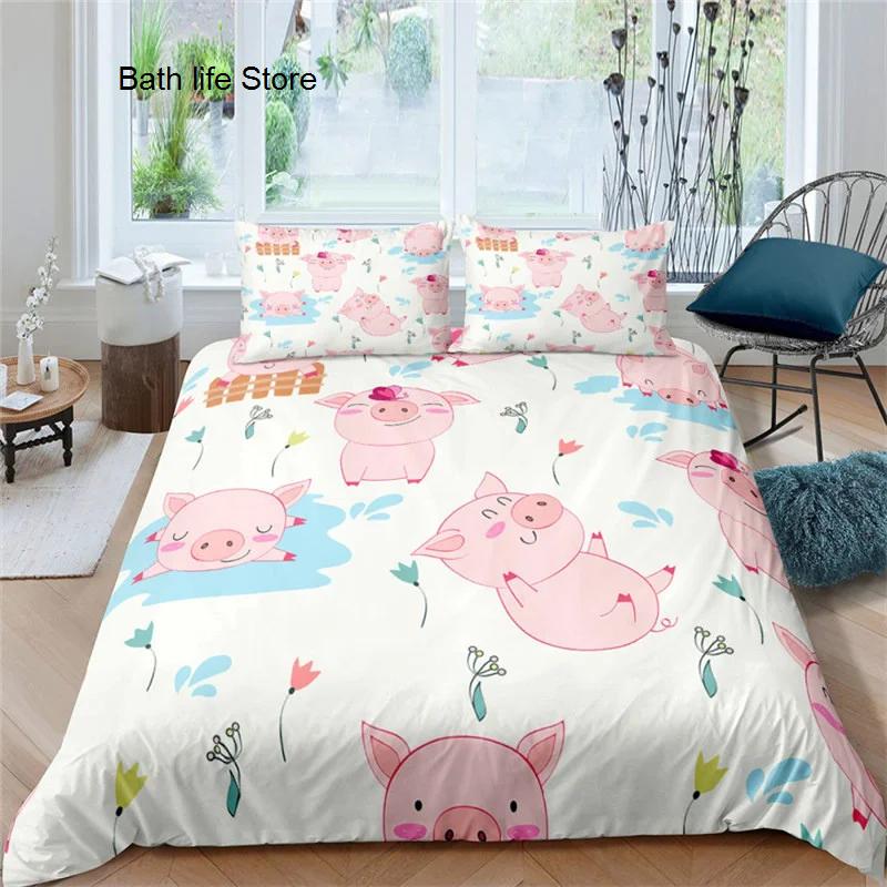 Cartoon Lovely Pig Duvet Cover Set Kawaii Animal Bedding Set King Microfiber Farmhouse Wildlife Theme Comforter Cover Pillowcase