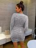 New Women's Sequin Pleated Evening Gown Long Sleeve V-Neck Sexy Nightclub Solid Color Dress