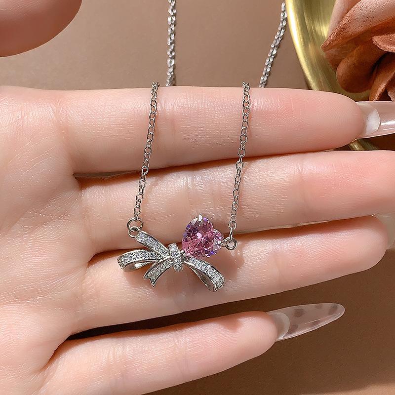 Send Girlfriend Feeling Flash Bow Necklace Niche Design Day Diamond Collarbone Chain Powder Simple Women'S Zirconium Pendant