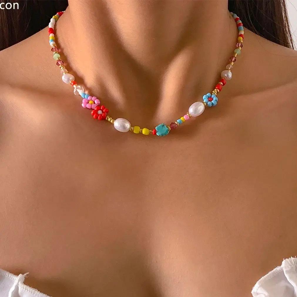 Baroque Hand-woven Simulated Pearls Cute Flowers Colorful Beaded Short Clavicle Chain Choker Necklace for Women Girls
