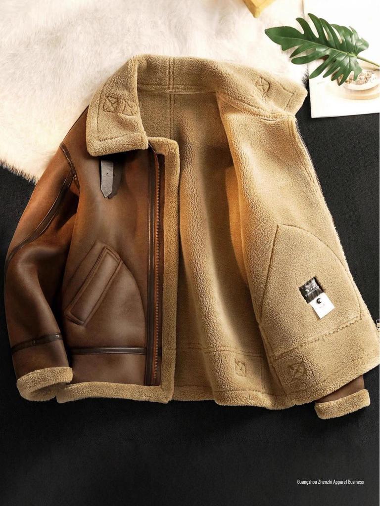 Men's Lambswool-Lined Leather Jacket with Fur Collar - Autumn/Winter Motorcycle Style