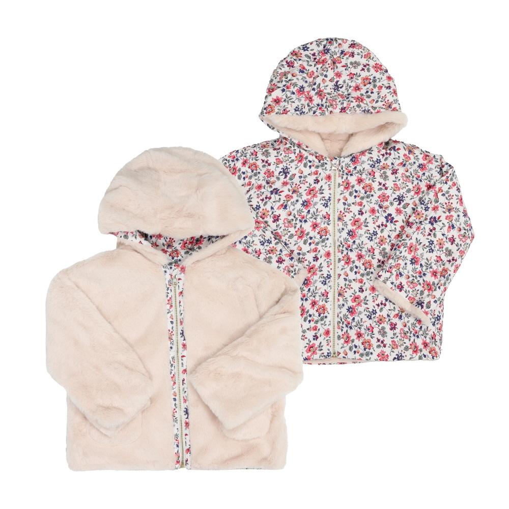 The LouisMisha Children's Coat Velvet Floral Reversible GRC-W25-R0081 is designed with a cute floral pattern and made from soft velvet material. This product is available in ivory color, enhancing the child's charm while featuring a design that can be styled in two ways.