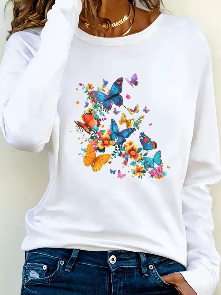 (Asian Size) Lovely Butterfly Style Print T Shirt Tee Women Clothing Autumn Winter Spring Casual Fashion Top O-neck Graphic Long Sleeve T-shirts