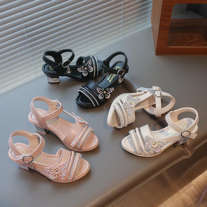 Girls' Summer Sandals with Rhinestone Butterflies, Children's Fashionable High Heels, Versatile Princess Style
