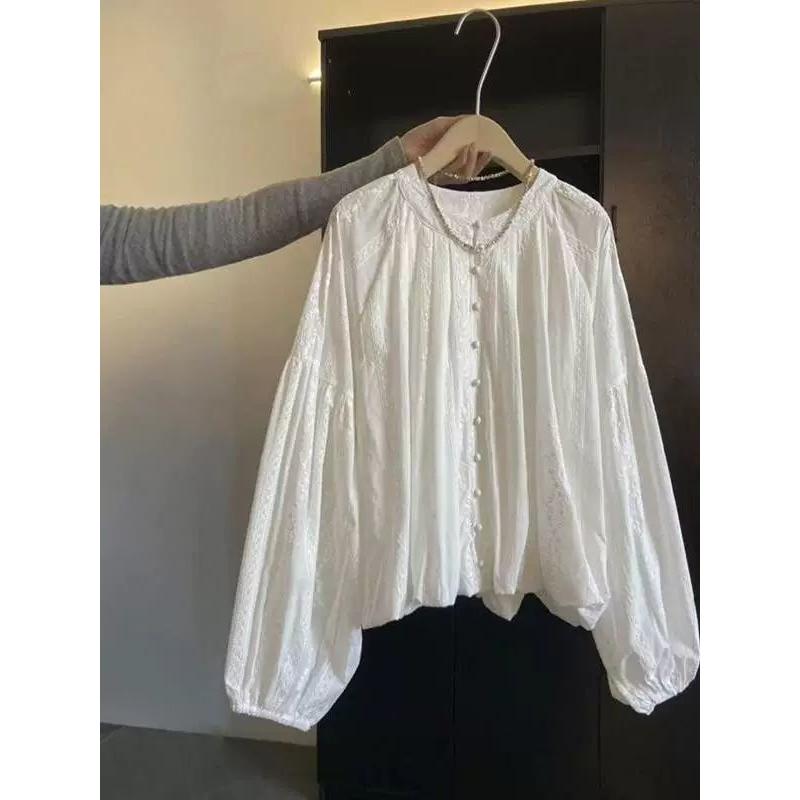 Round Neck Heavily Embroidered White Shirt for Women with Pleated Design Bud Hem Loose Versatile Top
