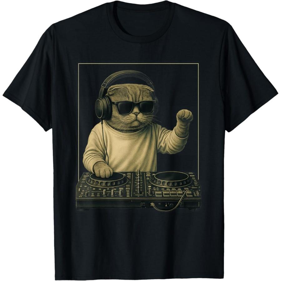 Huyarin Vintage Scottish Fold Cat Playing DJ for Feline Lovers Music T-Shirt