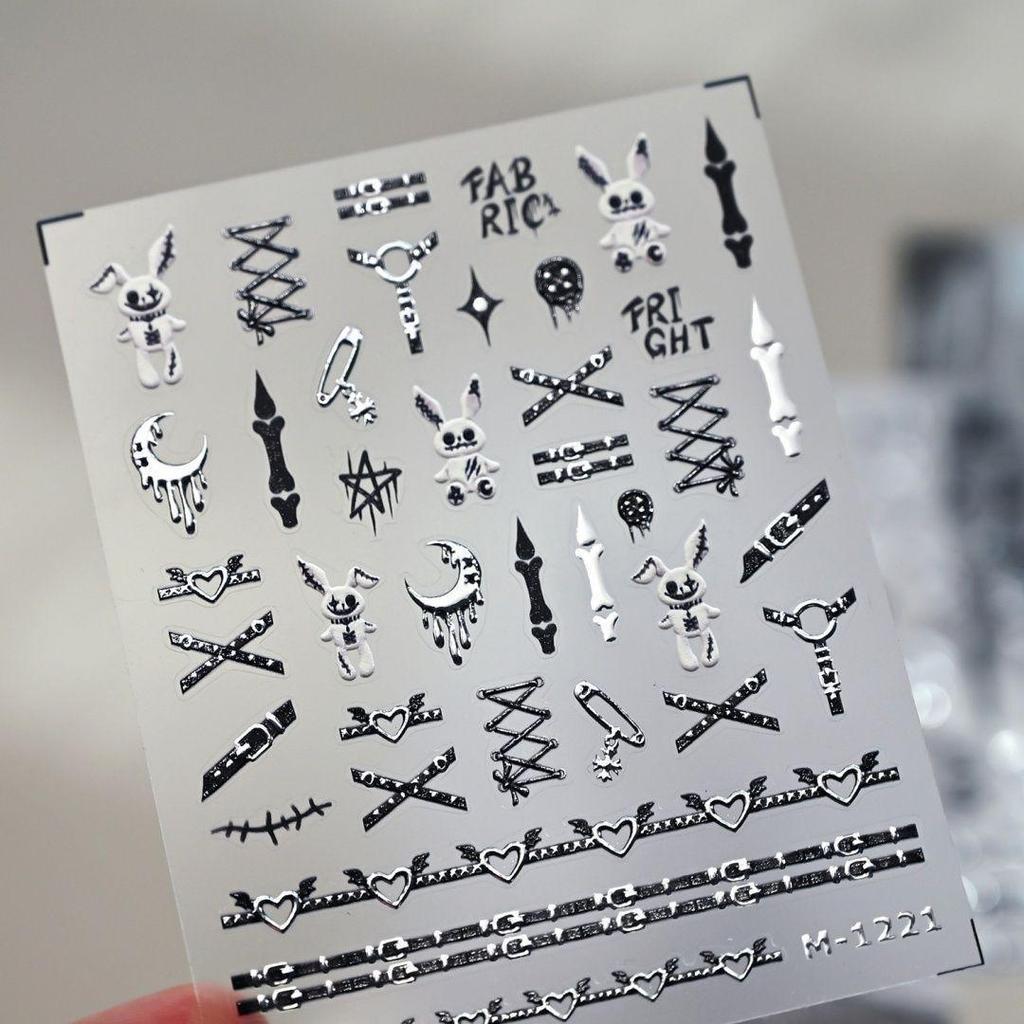 Dark Stitched Horror Rabbit Nail Stickers - DIY Liquid Metal Moon and Cross Design
