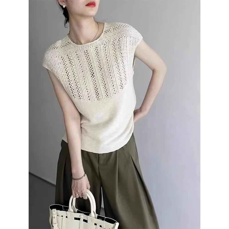 Spring New Fashionable Casual Simple Ice Silk Thin Knitted T-shirt for Women's Summer Hollow Out Design All-match Fashion Top