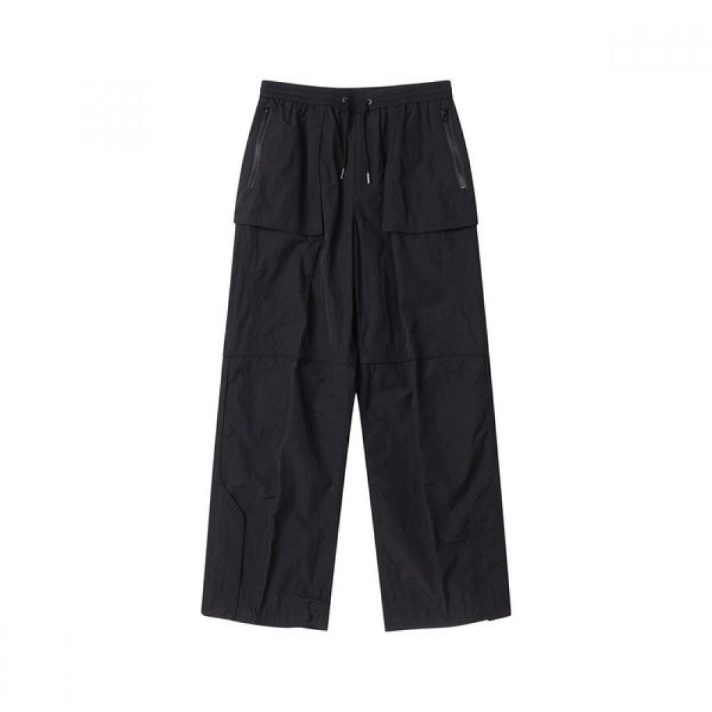 The Black Banding Slit Pants CWPAM25353BKX features a design with cutting seams and snaps that flexibly allows movement at joints, and a string for various styling options. Made from lightweight nylon material, it offers comfortable wear and features a relaxed fit silhouette suitable for various styles.