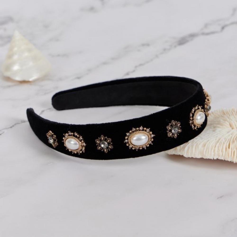 The MAIA Velvet Antique Pearl Hairband (MAIAHB153) is made of sophisticated velvet fabric, decorated with antique pearl accents for an elegant atmosphere. It provides a comfortable feel when worn and features a retro-inspired design. Each item is carefully crafted upon order, being a handmade product made with careful attention to detail.