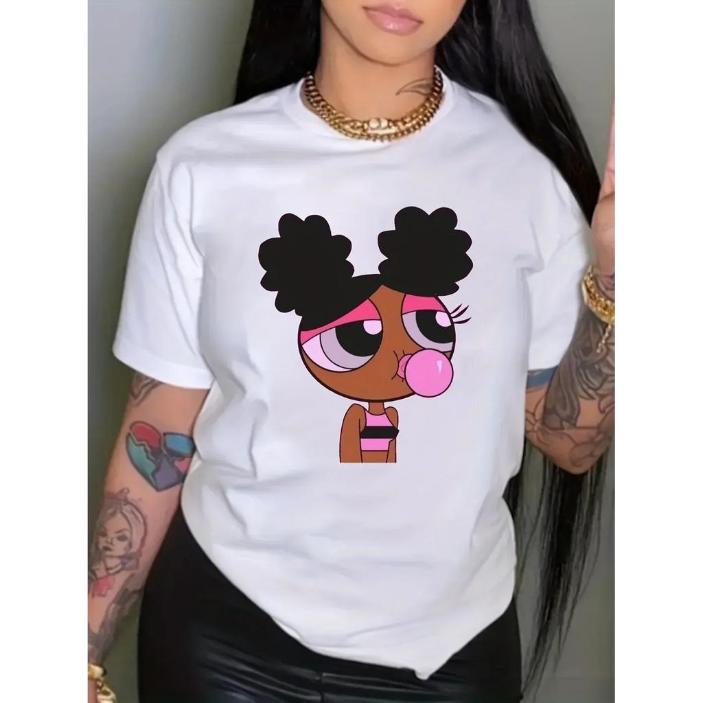 Cartoon Print Crew Neck T-Shirt, Casual Short Sleeve Top For Spring & Summer, Women's Clothing