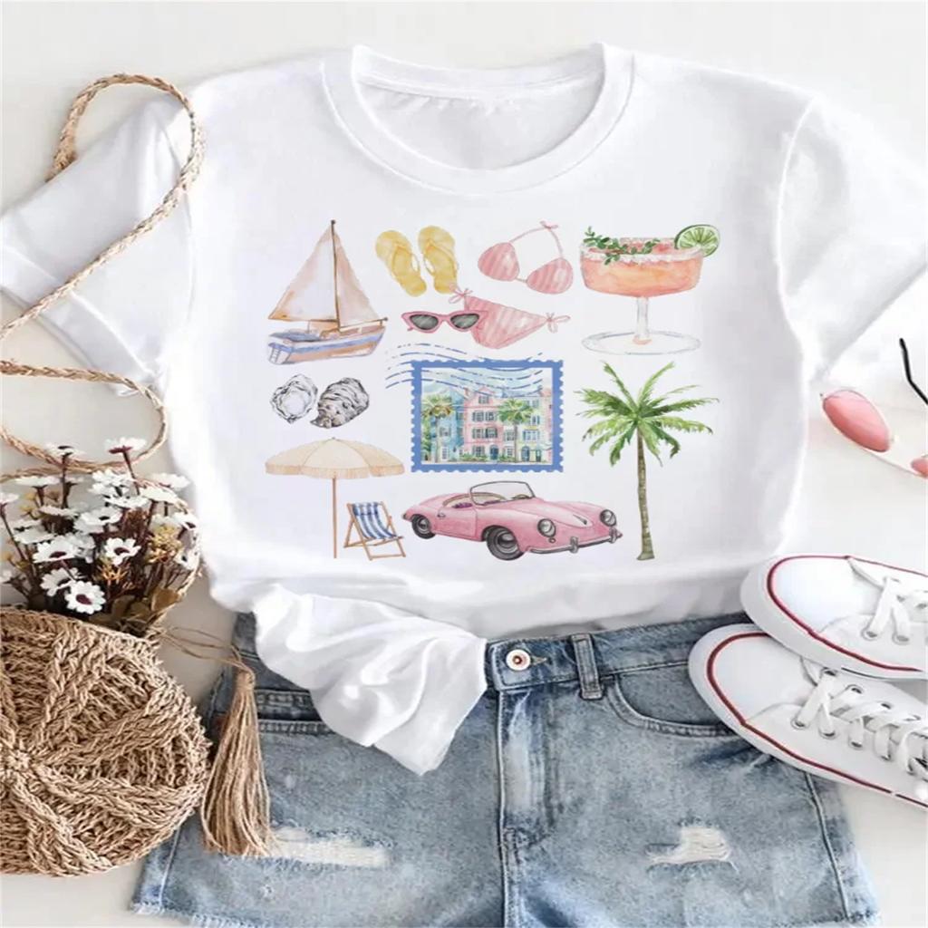 Beach Travel Cute Women's Clothing Cartoon Round Neck 90s Casual Fashion Short Sleeve Printed Women's Basic Top Pattern T-Shirt