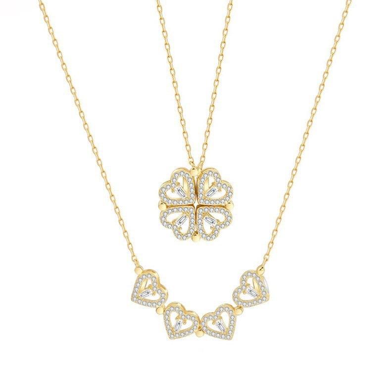 C211 Simple Heart-to-Heart Four-Leaf Clover Necklace for Women Fashion Collarbone Chain Heart Foldable Two-Way Pendant Necklace