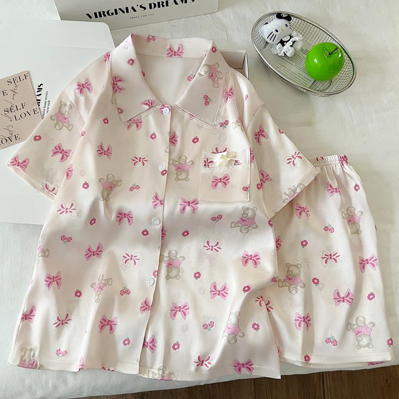 Sweet Style Casual Cartoon Bear Ice Silk Pajamas Women'S Summer Short-Sleeved Suit Loungewear