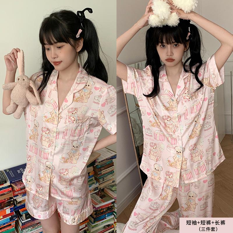 New Pajamas Women's Ice Silk Summer Short-sleeved Three-piece Silk [cake Bear] Loungewear Set Can Be Worn Outside