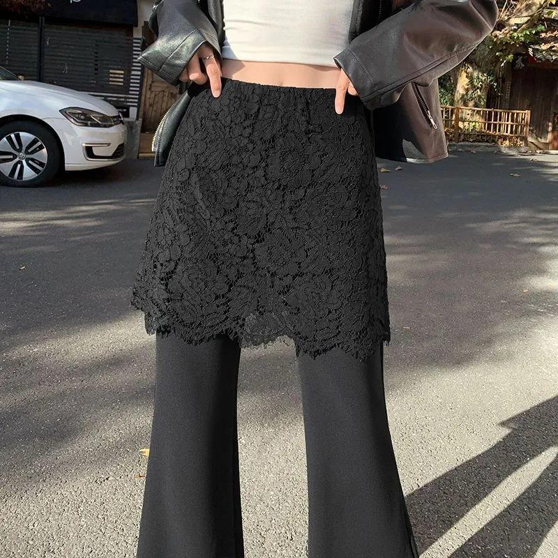 Women's Black Lace Overlay Flare Pants High Waist Tall Version Trouser Skirt