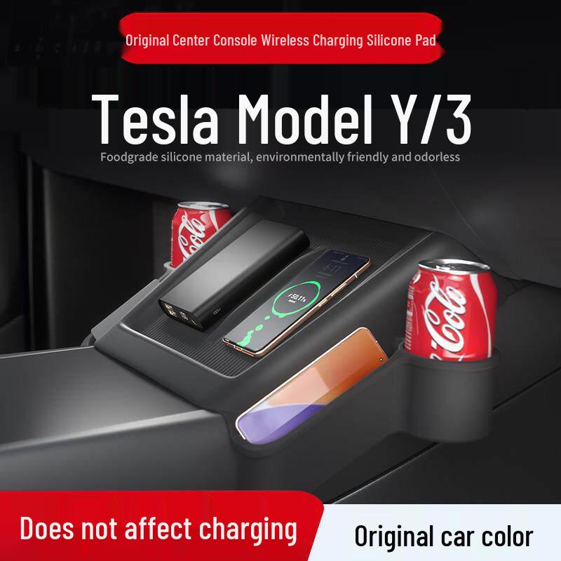 Tesla Wireless Charging Storage Pocket: Dustproof, Wear-resistant, Non-slip, Noiseless, with Dual Cup Holders.