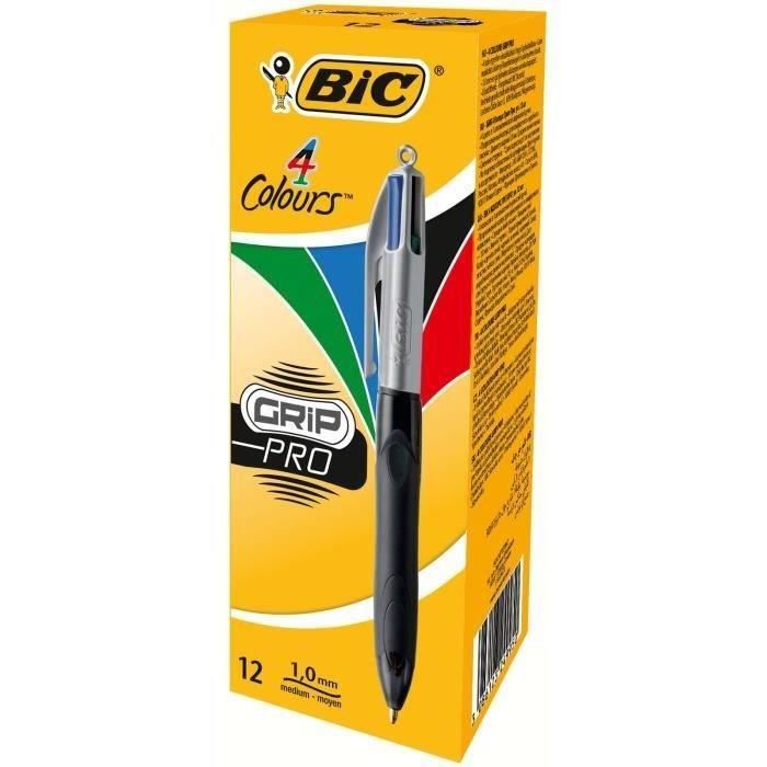 Stylo-bille - bic - 4 couleurs® grip - boîte de 12 - encre assortie - pointe moyenne