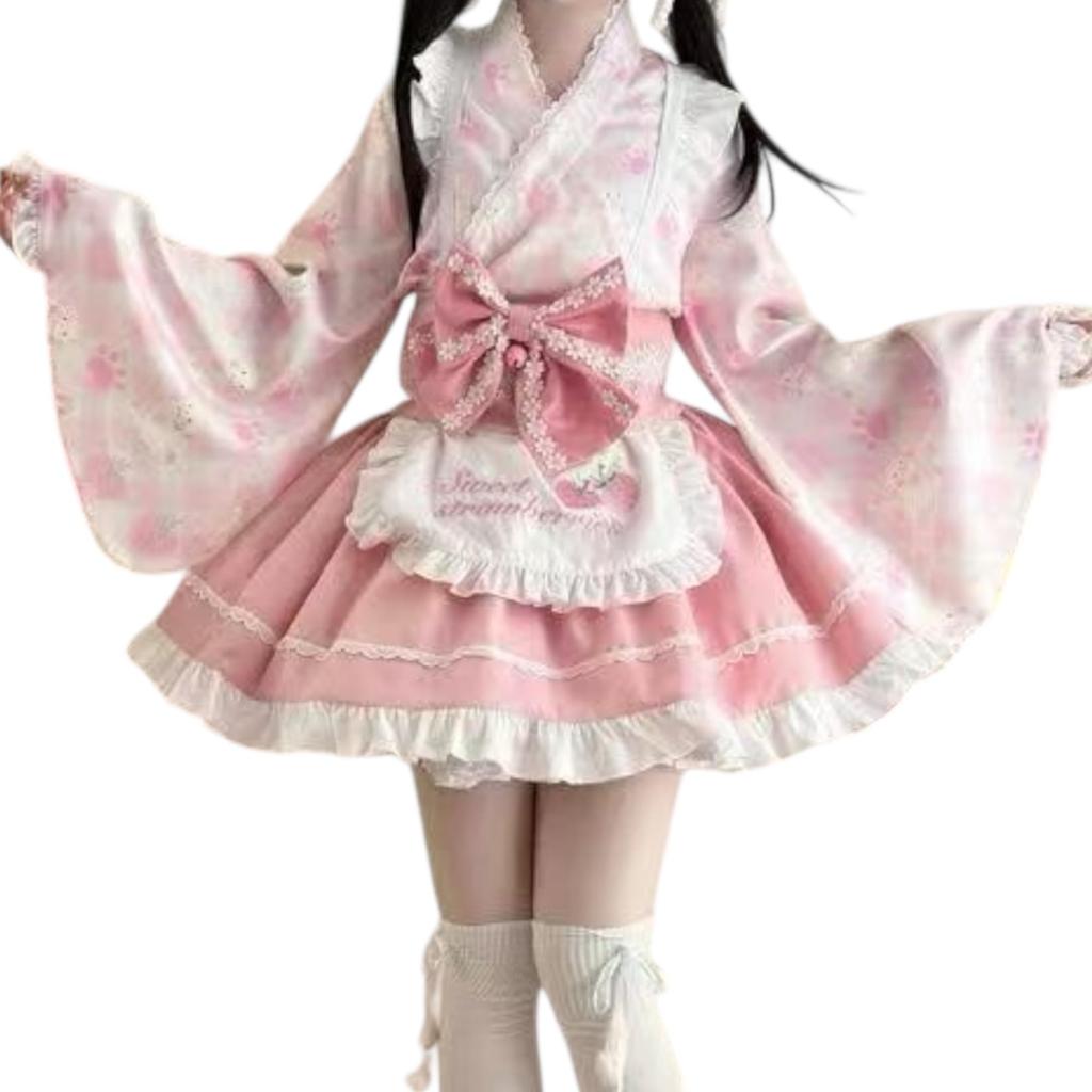 The kimono-style top and frilly skirt create a three-dimensional silhouette that looks cute from any angle. It comes in two colors, pink and light blue, and is available as a set with a cat ear headband or as a standalone outfit. Each item is also available individually, allowing you to create your own unique outfit.