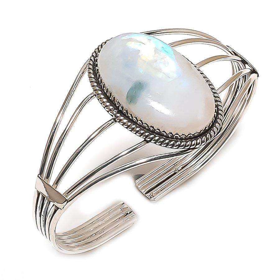 Natural Moonstone Gemstone 925 Sterling Silver Cuff Bangle Adjustable ETC-13921