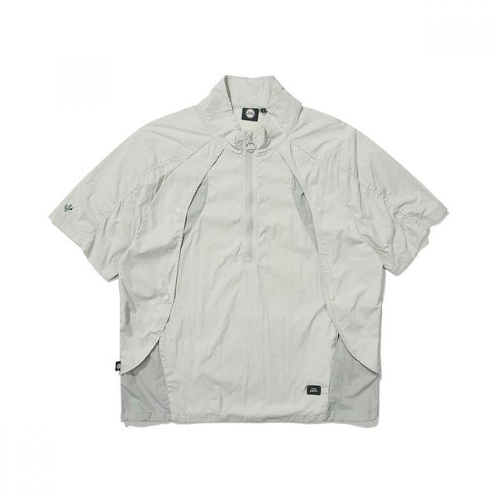 The [24SS] Earth Color Block Curved Anorak (Light Mint) features a short-sleeve anorak with a design reflecting curved lines, enhanced by color block curves and asymmetric three-dimensional pockets giving it a trendy style. Raglan sleeves and shirring points enhance mobility.