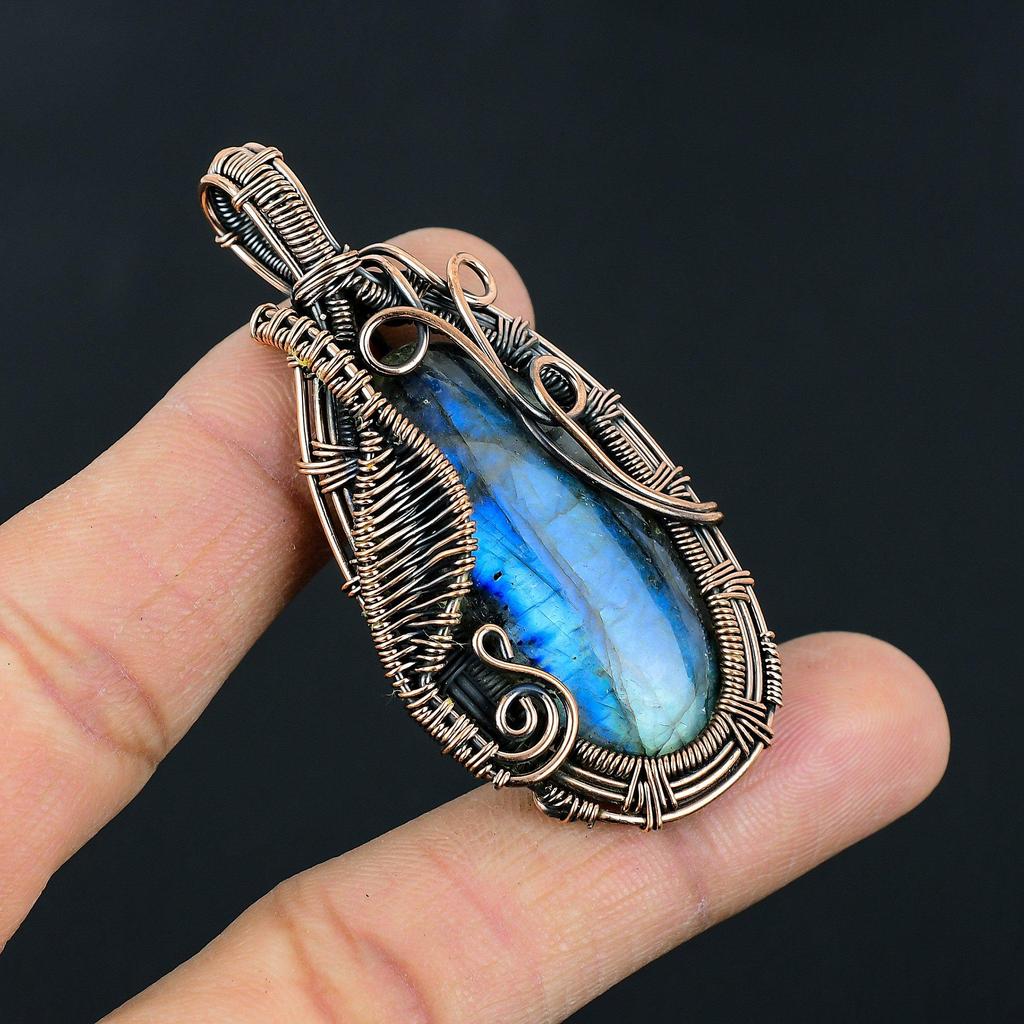 Handmade Labradorite Wire Wrapped Pendant Blue Flash Gemstone Necklace Antique Copper Jewelry for Women & Men