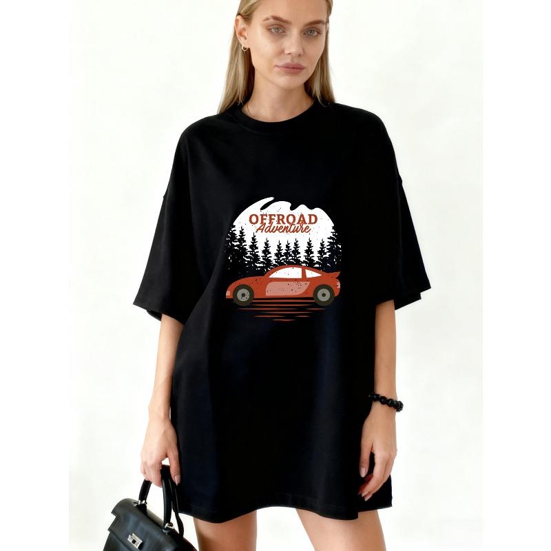 Oversized T Shirt Black Offroad Adventure Car And Pine Trees Print For Outdoor Activities