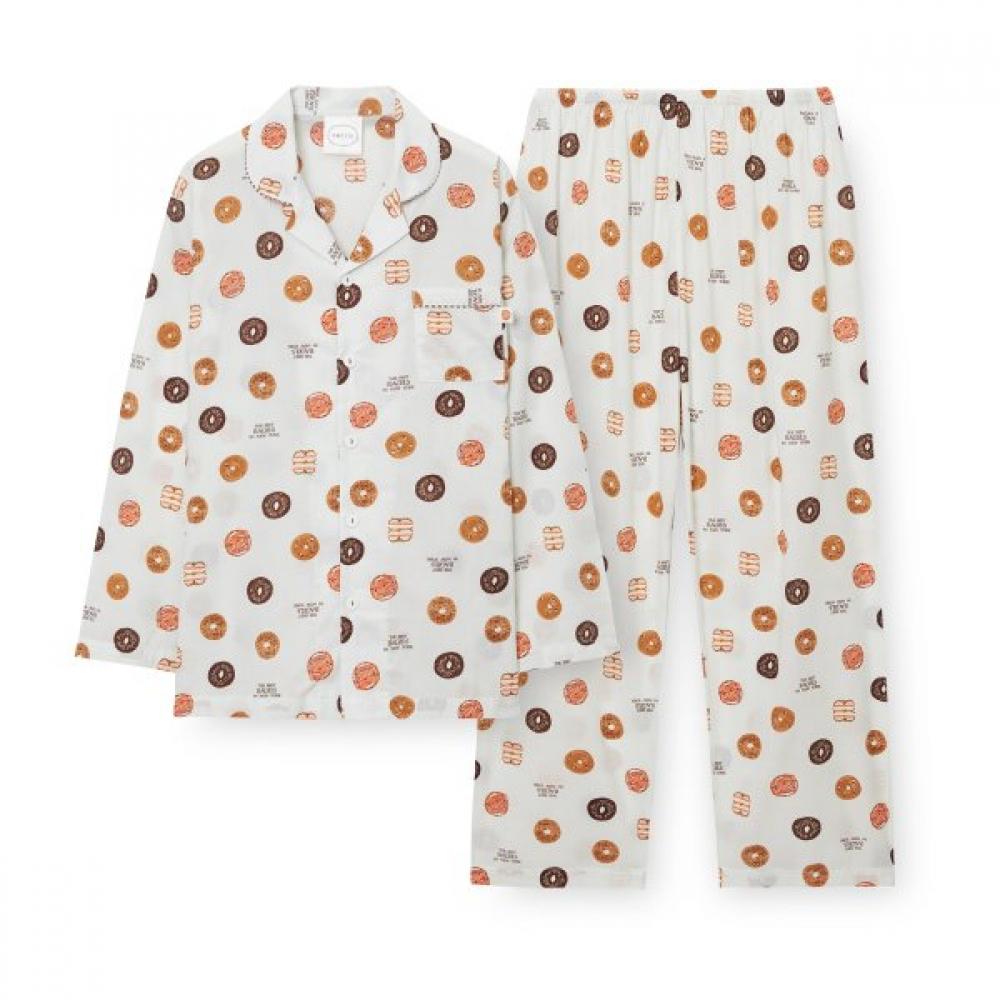 The Orcite Men's G008 New York Bagel Long Sleeve Pajama Set features a long-sleeve top and bottoms with a New York bagel pattern, ideal for men and suitable for comfortable homewear. Its standout bagel design allows for casual use as everyday pajamas or easy wear.
