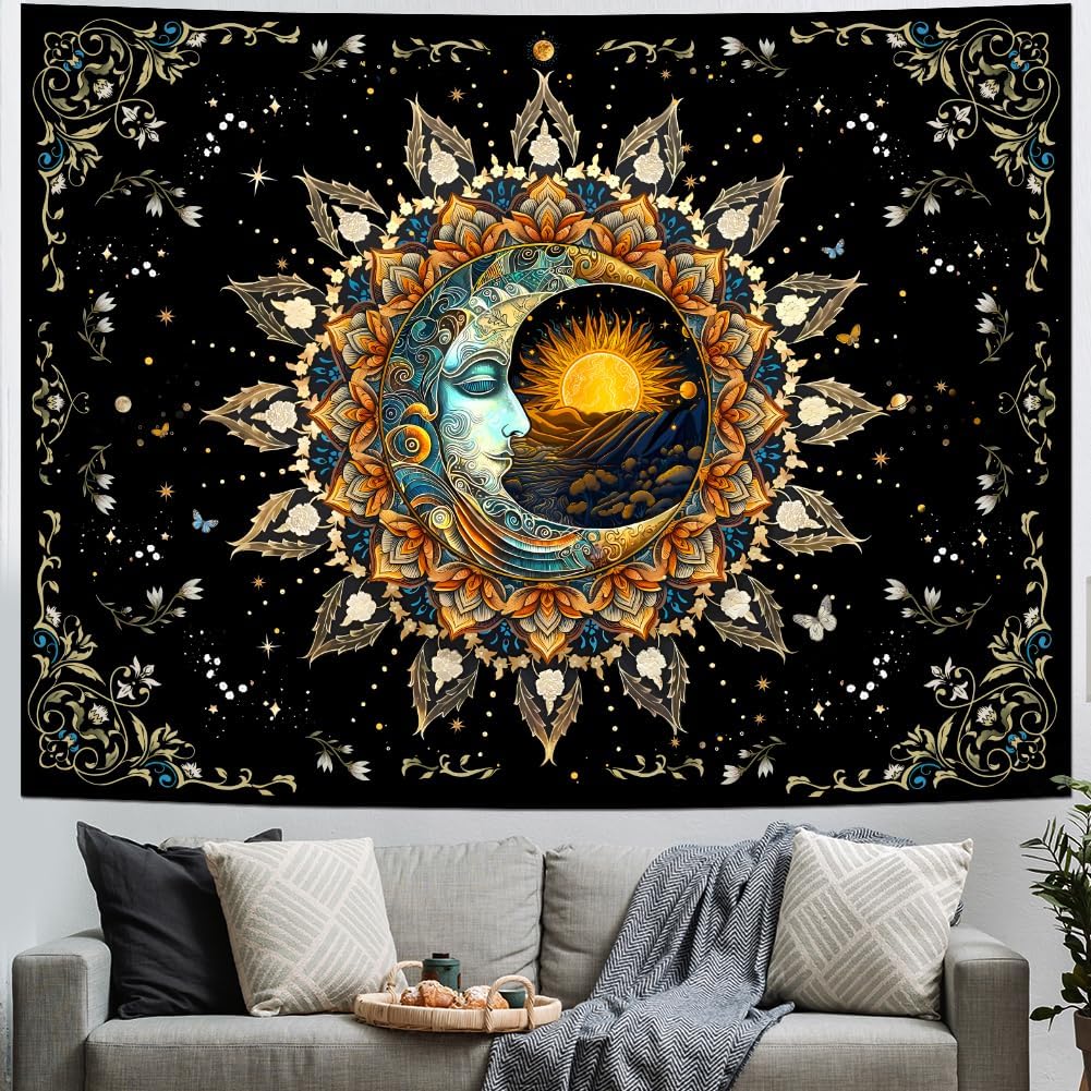 Ameyahud Moon and Sun Tapestry Spiritual Mandala Tapestry Black Flower Plant Tapestries Hippie Boho Tapestries Vintage Aesthetic Wall Hanging Decor