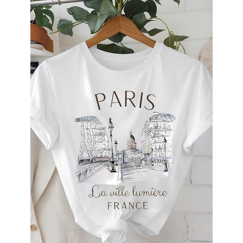 European Sizes Paris Print T-shirt, Short Sleeve Crew Neck Casual Top For Summer & Spring, Women's Clothing