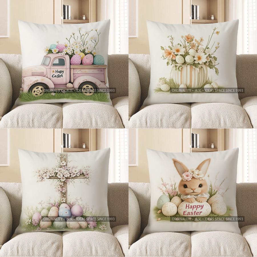 Home Decor Pink Easter Truck With Eggs And Flowers Pattern Cushion Cover Suitable For Sofa Bedroom Car Pillow Cover