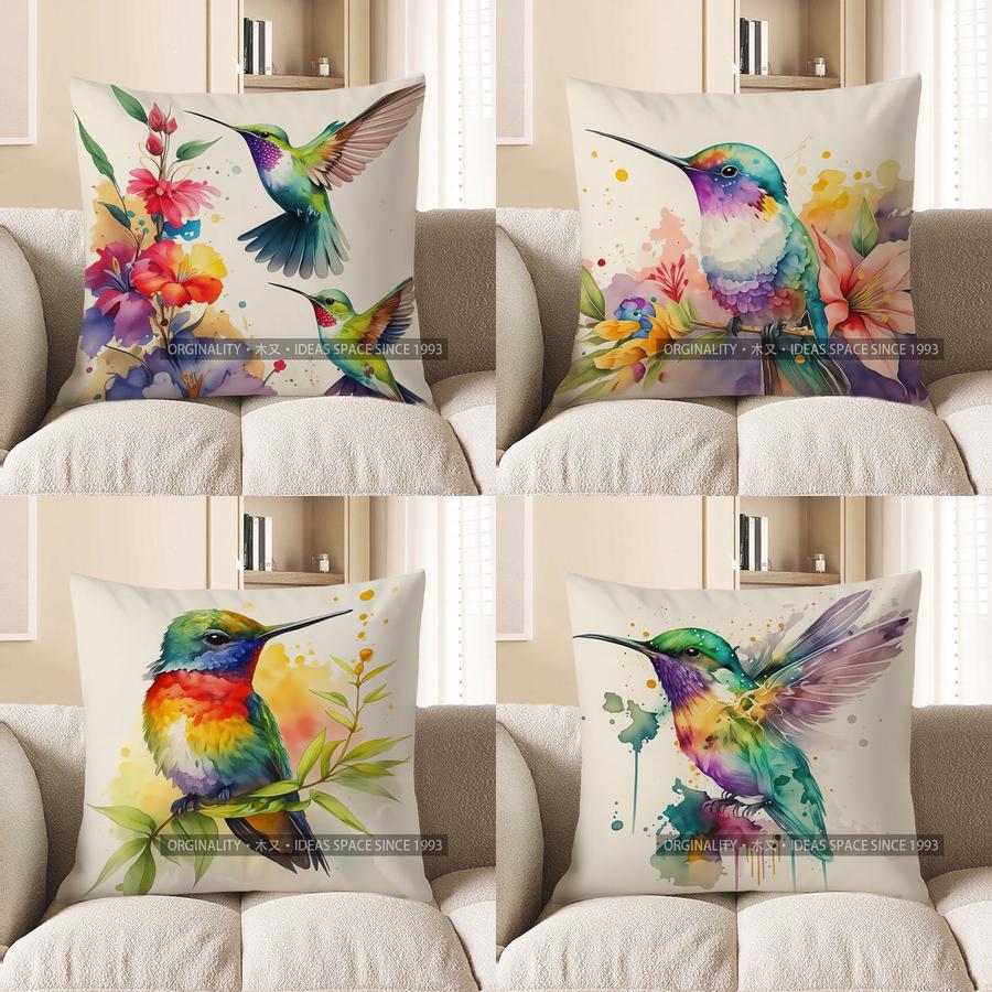 Home Decor Hummingbirds & Flowers Watercolor Pillow Cover Pattern Cushion Cover Suitable For Sofa Bedroom Car Pillow Cover