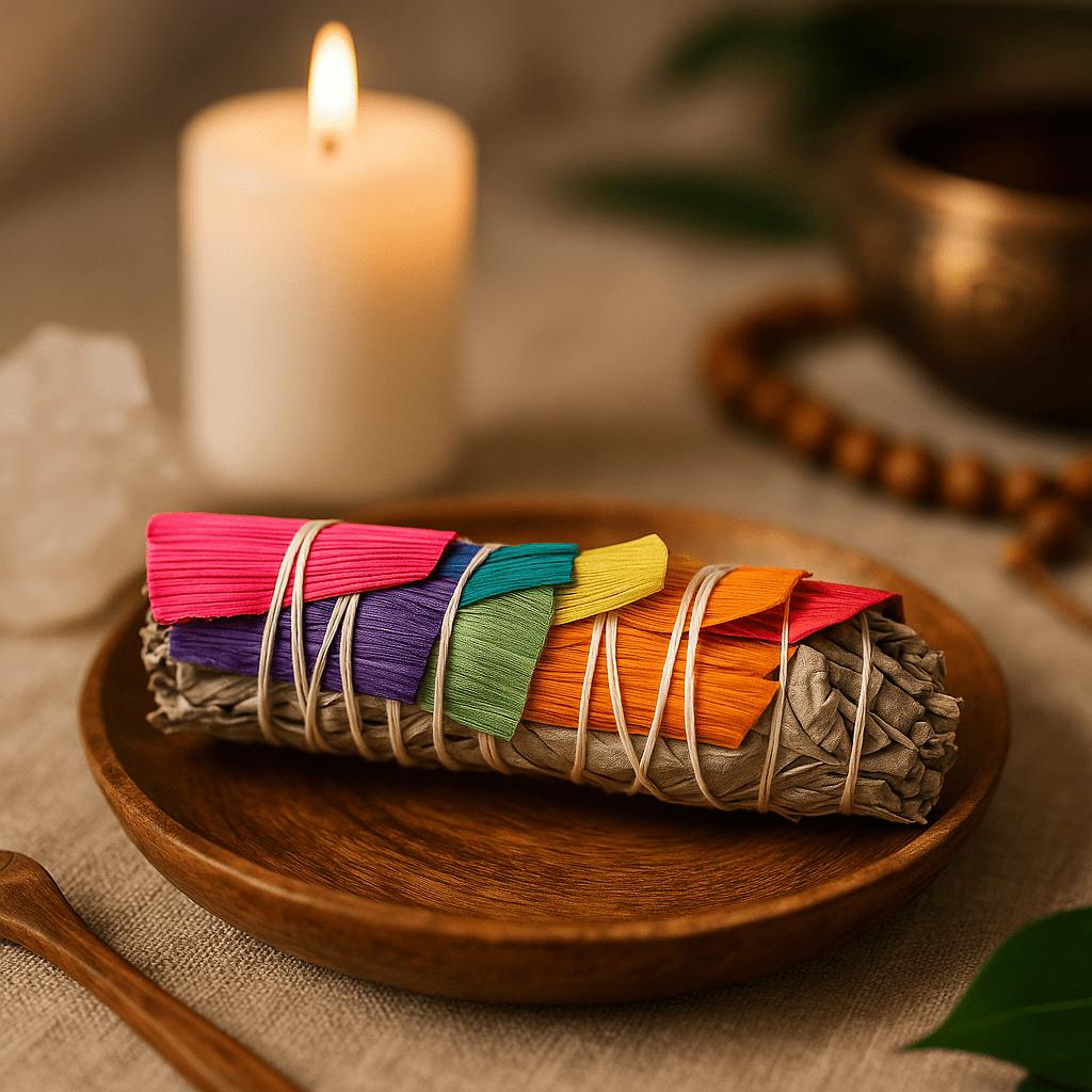 🌿 An ancient tool of purification, hand‑tied in Mexico from silvery white sage and accented with slender corn leaves in rainbow hues. The bundle feels rustic and compact in the hand; the leaves are crisp to the touch. When lit, it releases a clean, resinous aroma with soft notes of sun‑dried herb.