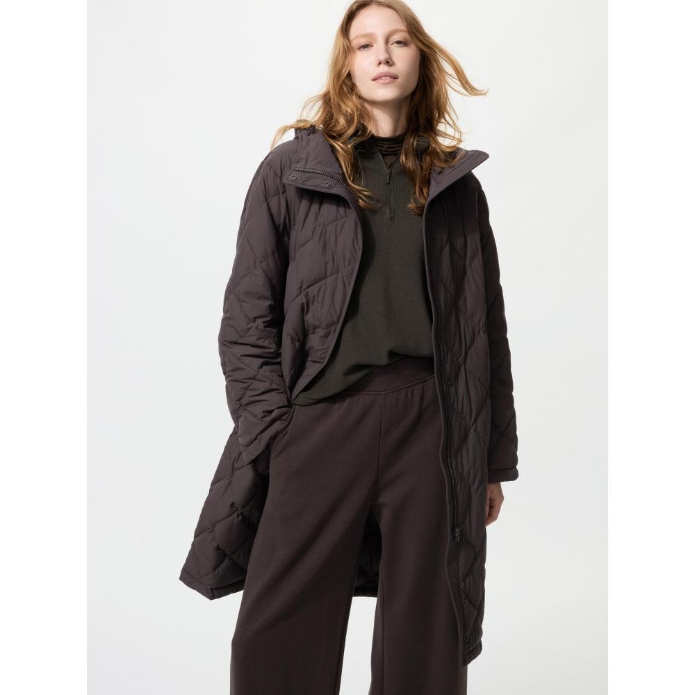 UNIQLO Japan Puff Tech Long Coat Relaxed Fit features a diamond quilted design with a concealed front, providing both neatness and casual elegance. The integrated hood and long length make it pair well with thicker inner layers and knits. It has pockets, but does not include a storage pouch.