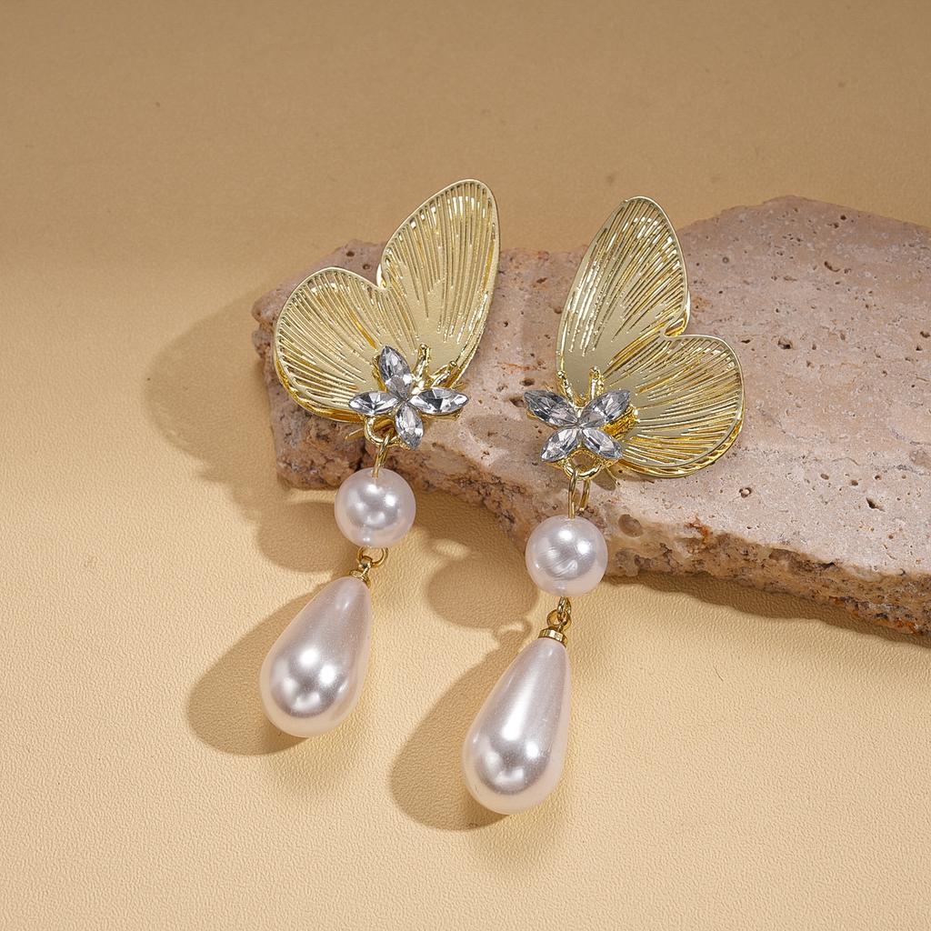 Diamond-encrusted Imitation Pearl Hollow Butterfly Water Drop Silver Needle Earrings Elegant Earrings