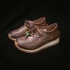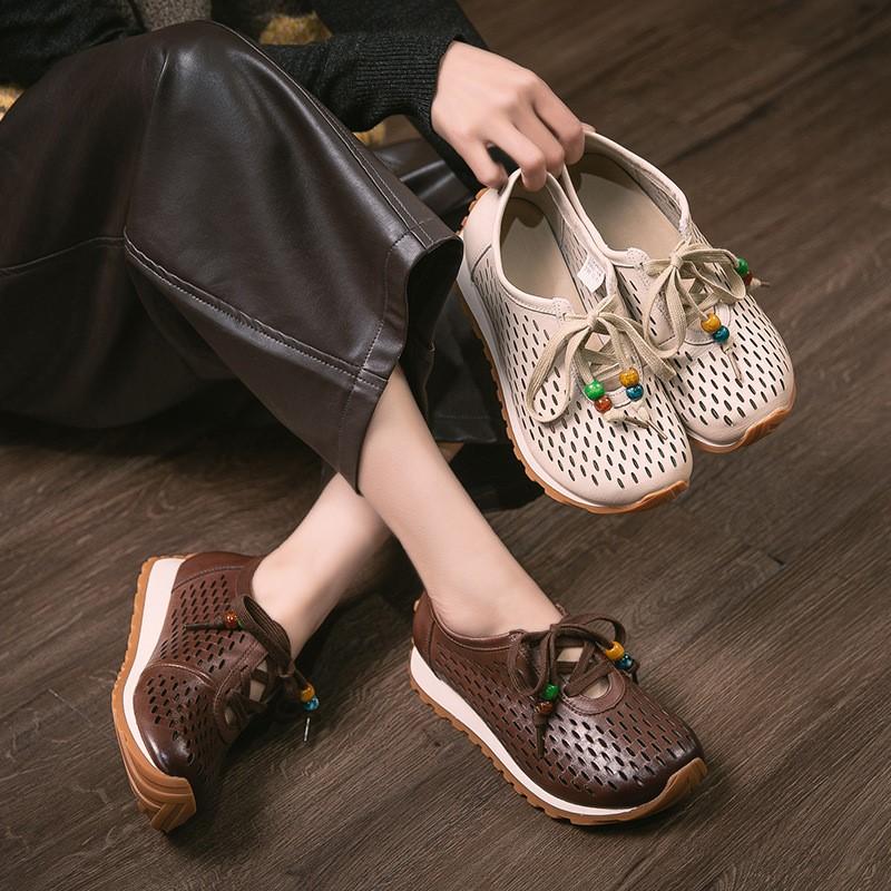 Johnature Genuine Leather Hollow-out Breathable Casual Shoes Lightweight Versatile Lace Up Women's Flat Shoes